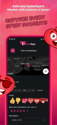 IntimApp : Sex Tracker and Map vám pomůže znovu objevit a sledovat vaše intimní chvíle. S důvěrou zaznamenávejte a analyzujte své soukromé zážitky pomocí interaktivní mapy a detailních statistik. Prozkoumejte frekvenci, oblíbená místa a trvání. Volitelně sdílejte SweetSpots s důvěryhodnými přáteli pro inspiraci a hlubší pochopení vašeho intimního života.