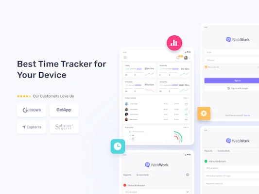 Společnost WebWork je uznávaným lídrem v oboru, oceněným předními platformami pro recenze SaaS. Byla označena jako „High Performer" v oblasti sledování času G2, „Category Leader" v monitorování zaměstnanců GetApp a „Front Runner" pro řízení pracovní síly Software Advice. Dále se objevila na seznamu „Time Tracking Shortlist" Capterra, je uznávána jako jeden z nejrychleji rostoucích nástrojů pro sledování času podle SaaSworthy a Software World ji ocenil jako nejlépe hodnocený nástroj pro sledování času. Kontrolujte svůj čas efektivně a bez námahy, kdekoli a kdykoli. Začněte svou 14denní bezplatnou zkušební verzi ještě dnes a objevte jednoduché sledování času bez nutnosti zadávat údaje o platební kartě.
